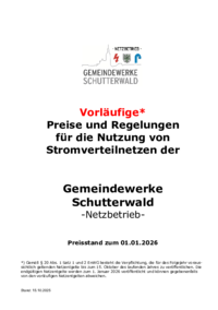 Vorläufige* Preise und Regelungen für die Nutzung von Stromverteilnetzen der Gemeindewerke Schutterwald -Netzbetrieb- Preisstand zum 01.01.2026 *) Gemäß § 20 Abs. 1 Satz 1 und 2 EnWG besteht die…